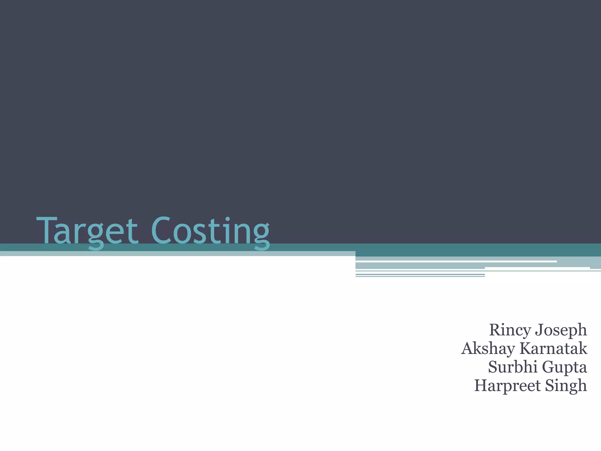 This document discusses target costing, which is a process that develops costs for a product or service based on market considerations like the target price customers will pay. It involves estimating the target price, target profit, and target cost. Target cost is calculated as the target price minus the target profit. The key steps are computing the target cost, setting gross target sales and operating income, then determining the target cost per unit. The benefits are a focus on customers, cross-functional involvement, and commitment to innovation. Potential downsides include delays from overloaded features, and conflicts from pressure to excessively cut costs.