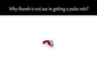 Your pulse is your heart rate measured in beats per minute. A normal resting pulse for children is 70-100 bpm, and 60-100 bpm for adults over 18. Your pulse increases with exercise as more oxygen-rich blood is needed by the body and decreases at rest. Common places to check your pulse include the wrist, neck, temple, knee, and foot.
