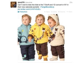 The Target Bundle Up campaign aims to encourage earlier winter jacket purchases through bundling accessories. It will integrate promotions into the Cartwheel app, offer an exclusive concert series sweepstakes, and employ Twitter advertising with hashtags like #TargetBundleUp. The goal is to bring customers in sooner while building the Target brand through digital strategies and potentially ongoing seasonal bundles.