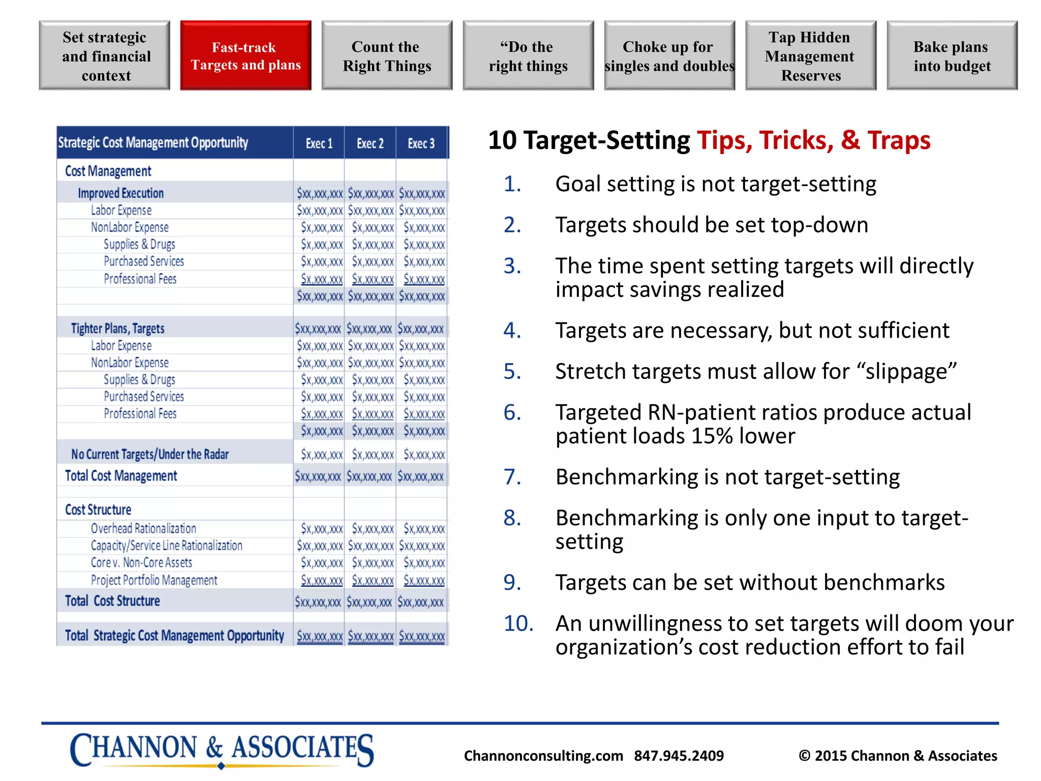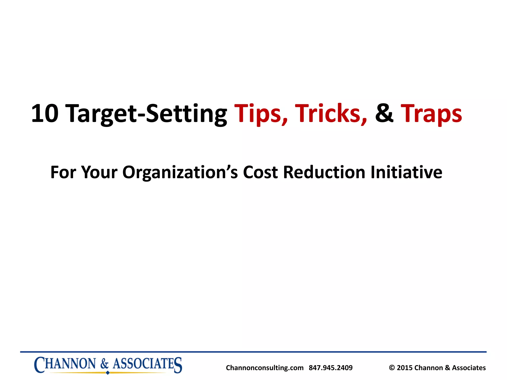 The document outlines 10 essential tips for effective target-setting in cost reduction initiatives for organizations. Key points emphasize the distinction between goal setting and target setting, the importance of top-down targets, and recognizing that targets alone won't guarantee success. It also suggests practical approaches for setting realistic targets and integrating them into organizational budgeting.