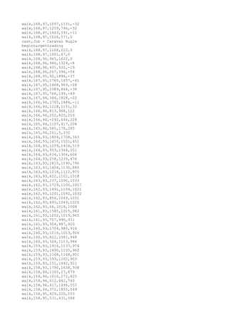 The document contains a series of "walk" commands with coordinates, indicating movement around a virtual space. It also contains a few other commands like "cast", "begintargettrading", and "teleport". Overall it traces a path of movement over many coordinates.