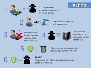 Документ описывает два случая продвинутых устойчивых угроз (APT), где преступники получают доступ к учетным записям собственников и топ-менеджеров компаний, используя различные методы, включая вредоносные программы и социальную инженерию. Основное внимание уделяется необходимости комплексного подхода к безопасности, вовлеченности руководства и подготовке к неожиданным угрозам. Указано, что абсолютной защиты не существует, и организациям следует готовиться к возможным атакам.