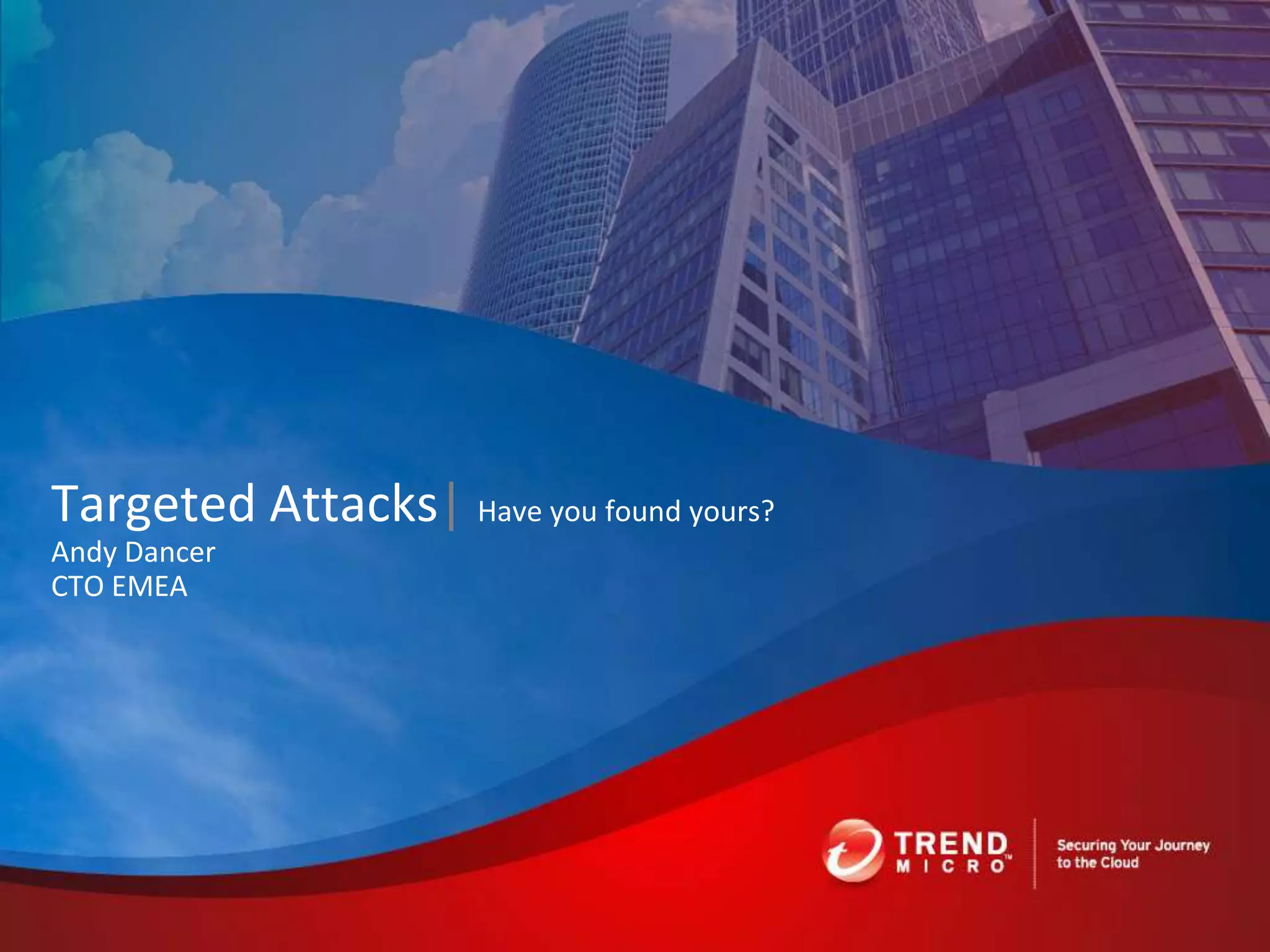 The document discusses advanced persistent threats and how traditional security methods are insufficient for dealing with them. It introduces Trend Micro's Deep Discovery and custom defense solutions, which use specialized threat detection, deep analysis, threat intelligence, and adaptive security updates to detect and block targeted attacks. This is done by monitoring networks for malicious content and communications, analyzing behaviors, and gaining insights to rapidly respond to and remediate threats.