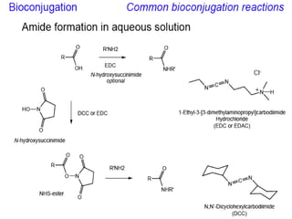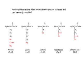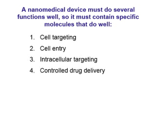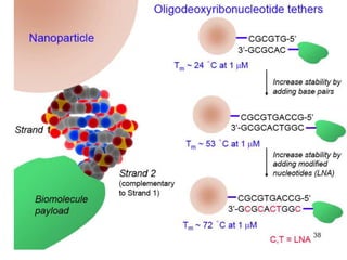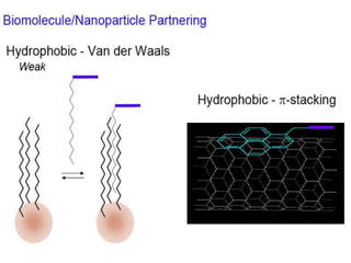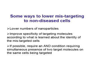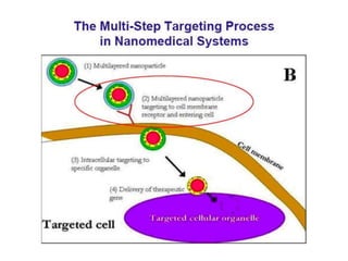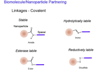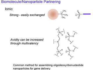 This document discusses surface modification of nanoparticles for biomedical applications. It describes various methods for modifying the nanoparticle surface, including conjugating ligands for cell targeting (e.g. antibodies, peptides, aptamers), encapsulating the nanoparticle core with lipids or polymers, and attaching targeting moieties via linkers like streptavidin-biotin. Common targets for surface ligands include receptors for VEGF, folate, transferrin and others. Aptamers and peptides are also discussed as targeting options.