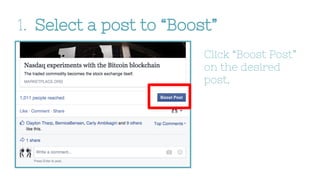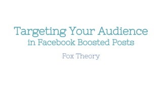 To target audiences on Facebook boosted posts: select a post to boost and click "Edit Audience" to modify the location and interests; add all relevant countries and narrow interest groups related to the post; adjust the budget as low as needed and click "Boost" to publish the targeted post.
