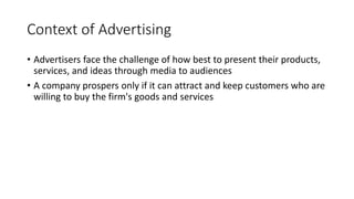 This document discusses key aspects of targeting and the marketing mix for advertising. It outlines the market segmentation process of identifying groups with shared needs and characteristics and aggregating these into market segments. It also discusses assessing the profit potential of segments and matching products to markets through the marketing mix of price, product, distribution, and communication. Finally, it notes that the marketing mix elements must be consistent with the brand image and that advertising success depends on factors like demand, differentiation, emotional appeal, and available funds.