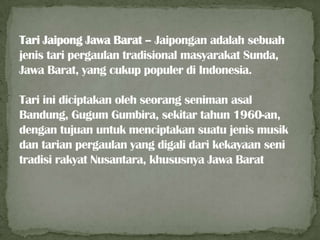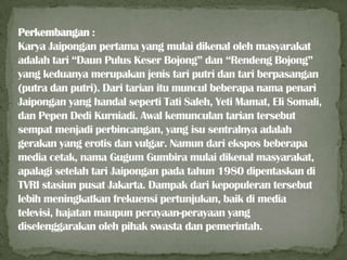 Tari Jaipong Jawa Barat memberikan kontribusi signifikan bagi penggiat seni tari dalam menggali jenis tarian rakyat. Penggiat seni mengadakan kursus tari jaipongan dan mengeksploitasi tarian ini di pub sebagai daya tarik. Hal ini juga berkontribusi pada pemberdayaan ekonomi melalui pembentukan sanggar tari di beberapa daerah di Jawa Barat.
