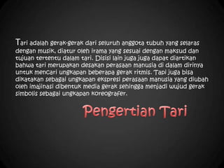 Tari Kidang adalah tari tradisional Jawa yang menggambarkan binatang kijang. Tari ini memiliki gerakan yang lincah dan gembira sesuai dengan karakter kijang. Unsur-unsur tari seperti gerakan, busana, tata rias, dan iringan musik disesuaikan untuk mendukung tema tari kijang dan menonjolkan karakteristik binatang tersebut.