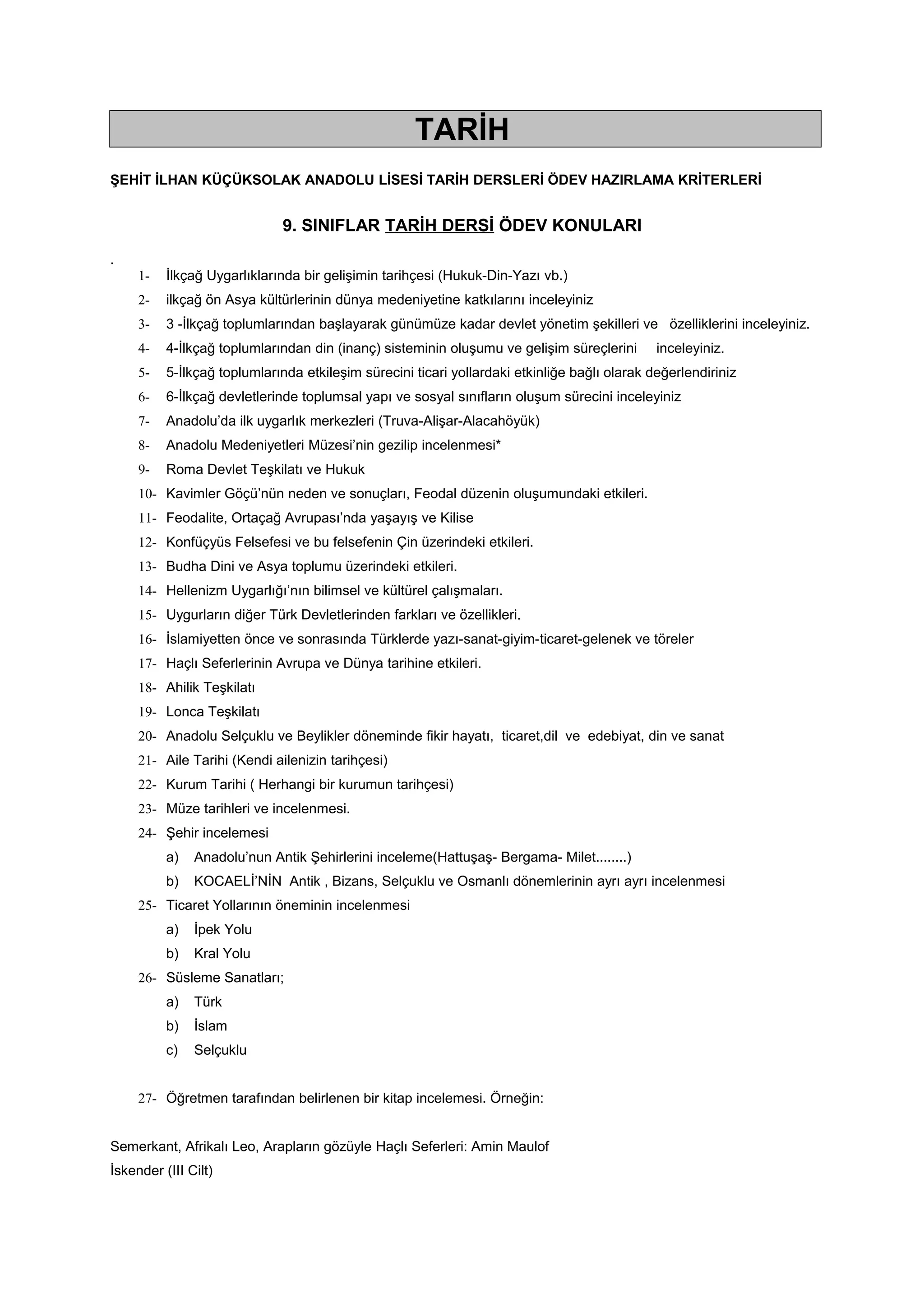 ŞEHİT İLHAN KÜÇÜKSOLAKANADOLU LİSESİ TARİH DERSLERİ ÖDEV HAZIRLAMA KRİTERLERİ