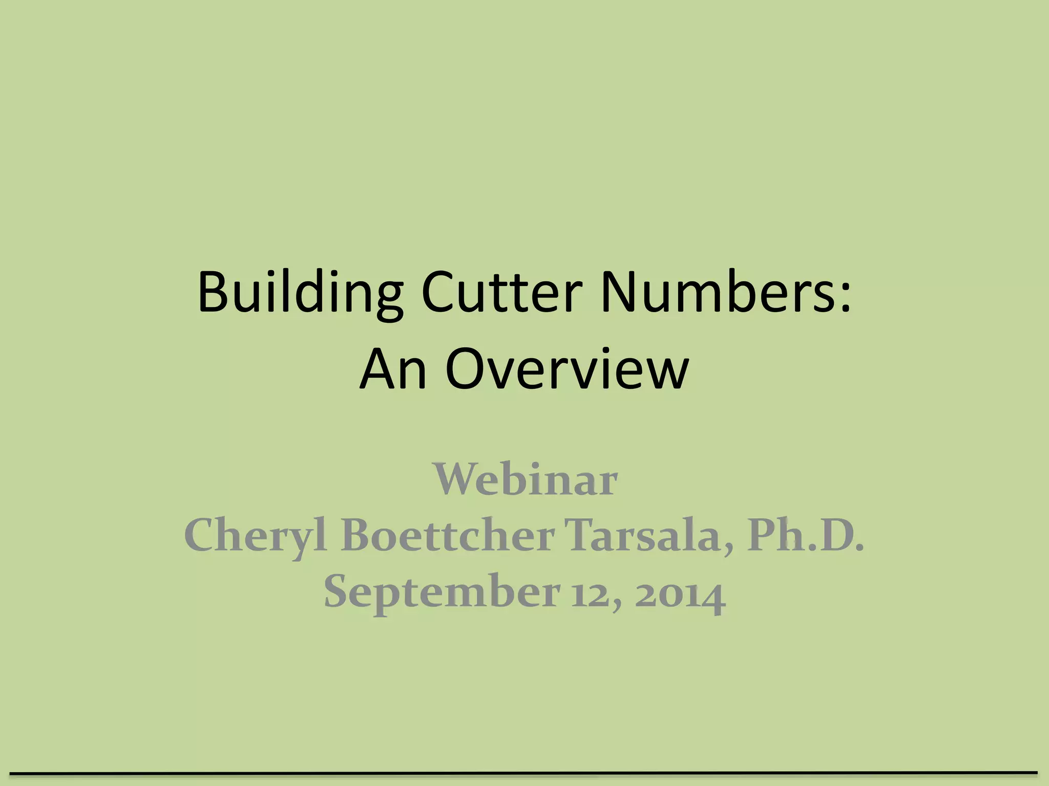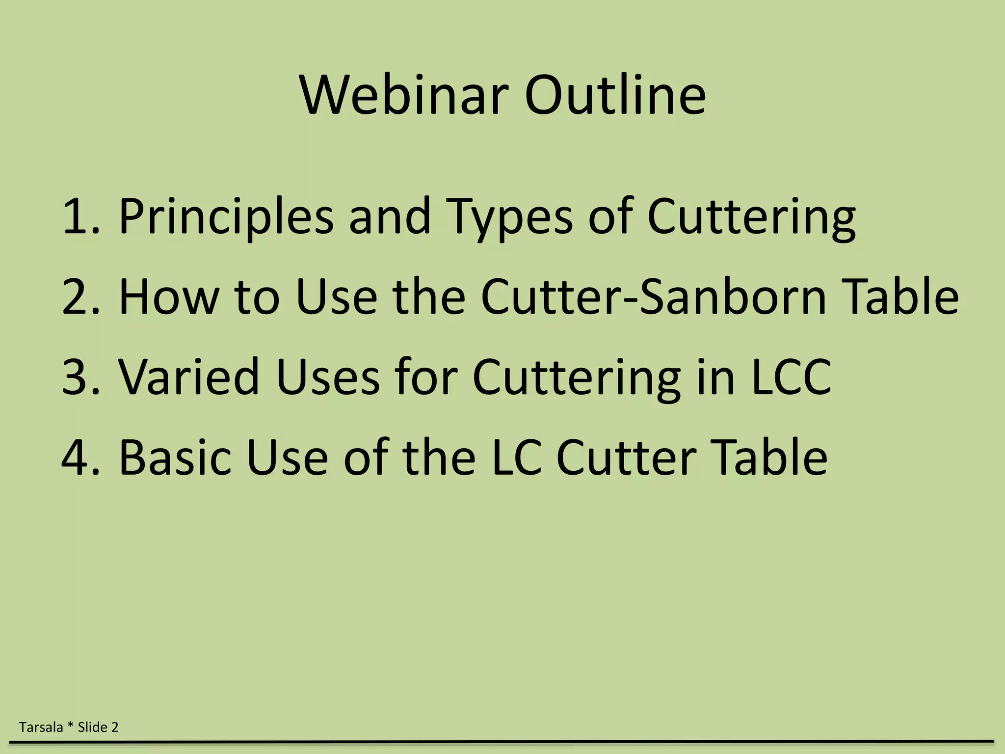 This document summarizes a webinar on cutter numbers given by Cheryl Boettcher Tarsala. It discusses the principles and types of cutter tables, including standalone tables and those used with the Library of Congress Classification system. Examples are provided of cuttering names from the Little House book series and assigning cutters to books on dogs classified in the LC system. The webinar outlines how cutter numbers provide a systematic way to alphabetically arrange materials on library shelves.