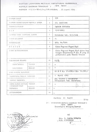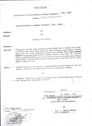 Dokumen ini berisi keputusan gubernur kepala daerah tentang pengangkatan calon pegawai negeri sipil di Jawa Barat, termasuk rincian tentang gaji dan masa kerja. Keputusan ini mencakup daftar pegawai yang diangkat beserta informasi penting lainnya, dan menyatakan bahwa jika terdapat kesalahan, perbaikan akan dilakukan sesuai ketentuan. Dokumen ditandatangani oleh gubernur pada tanggal 31 Maret 1984.