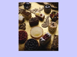 Tarts are more than just pies without tops. They can have a variety of doughs from flaky and crunchy to soft and rich. Common doughs include pate brisee (similar to pie dough), short doughs, pasta frolla, and brioche. Assembly can be either with an unbaked tart shell filled after or a baked "to be baked" shell with filling added before final baking. Key steps include rolling out the dough, pressing it into the pan, blind baking, then filling and finishing the tart. Flavors range from savory to sweet utilizing combinations of fruits, cheeses, chocolate, nuts and custards.