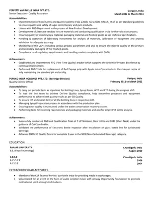 The document provides a summary of Tarun's professional experience and qualifications. It outlines his over 5 years of experience in quality assurance and manufacturing excellence in the food industry, including current role as Quality Executive at Pernod Ricard India Pvt. Ltd. It also lists his education qualifications of a B.E. in Food Technology and certifications in areas like HACCP, Six Sigma and FSSC 22000. Key responsibilities and achievements from previous roles at companies like PepsiCo, Perfetti Van Melle are also highlighted.