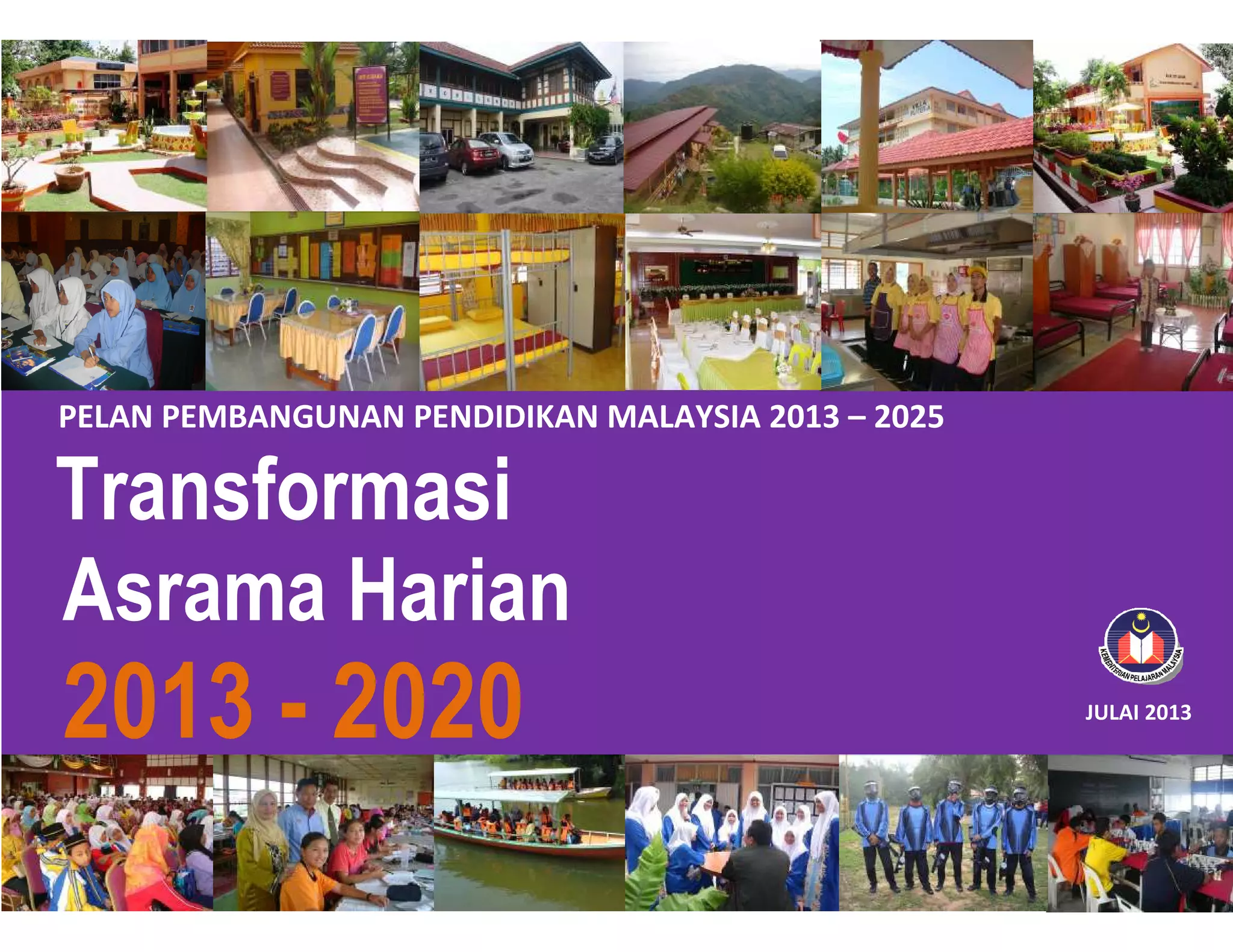 Dokumen ini merangkum pelan transformasi asrama harian di Malaysia bagi tahun 2013-2020 yang bertujuan meningkatkan akses, kualiti, dan ekuiti pendidikan dalam kalangan pelajar asrama. Ia menggariskan fasa pelaksanaan, strategi dan pencapaian yang diukur melalui petunjuk prestasi utama (KPI), serta menekankan peranan ibu bapa dan masyarakat dalam menyokong kejayaan pelajar. Transformasi ini diharapkan dapat memenuhi aspirasi pelan pembangunan pendidikan Malaysia 2013-2025 untuk menjadikan asrama sebagai tempat yang menyokong kejayaan akademik dan sahsiah pelajar.