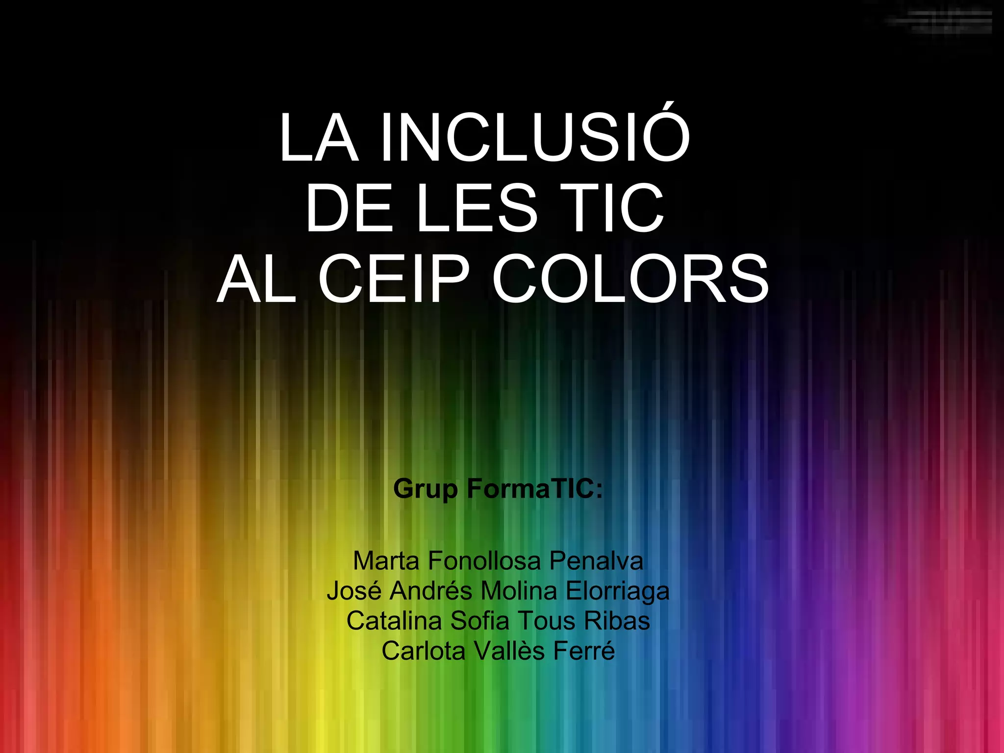 LA INCLUSIÓ DELES TIC AL CEIP COLORS Grup FormaTIC: Marta Fonollosa Penalva José Andrés Molina Elorriaga Catalina Sofia Tous Ribas Carlota Vallès Ferré