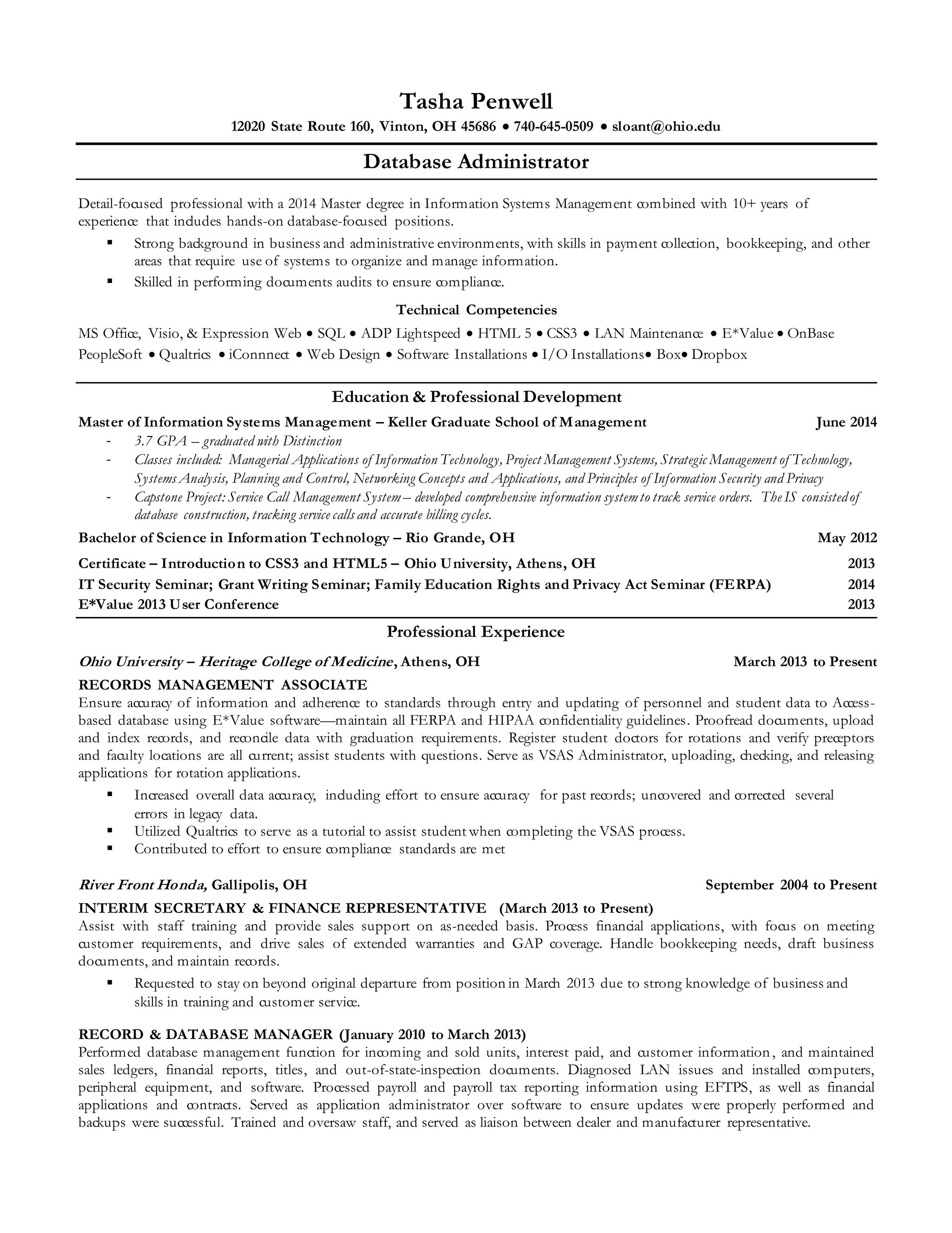 Tasha Penwell has over 10 years of experience in database administration and records management roles. She holds a Master's degree in Information Systems Management and has skills in MS Office, SQL, and various content management systems. Currently she works as a Records Management Associate at Ohio University, ensuring accurate student and personnel data entry and document management. Previously she held several roles such as Database Manager, Parts Manager, and Service Manager at River Front Honda, where she improved data accuracy, oversaw staff, and implemented process improvements.