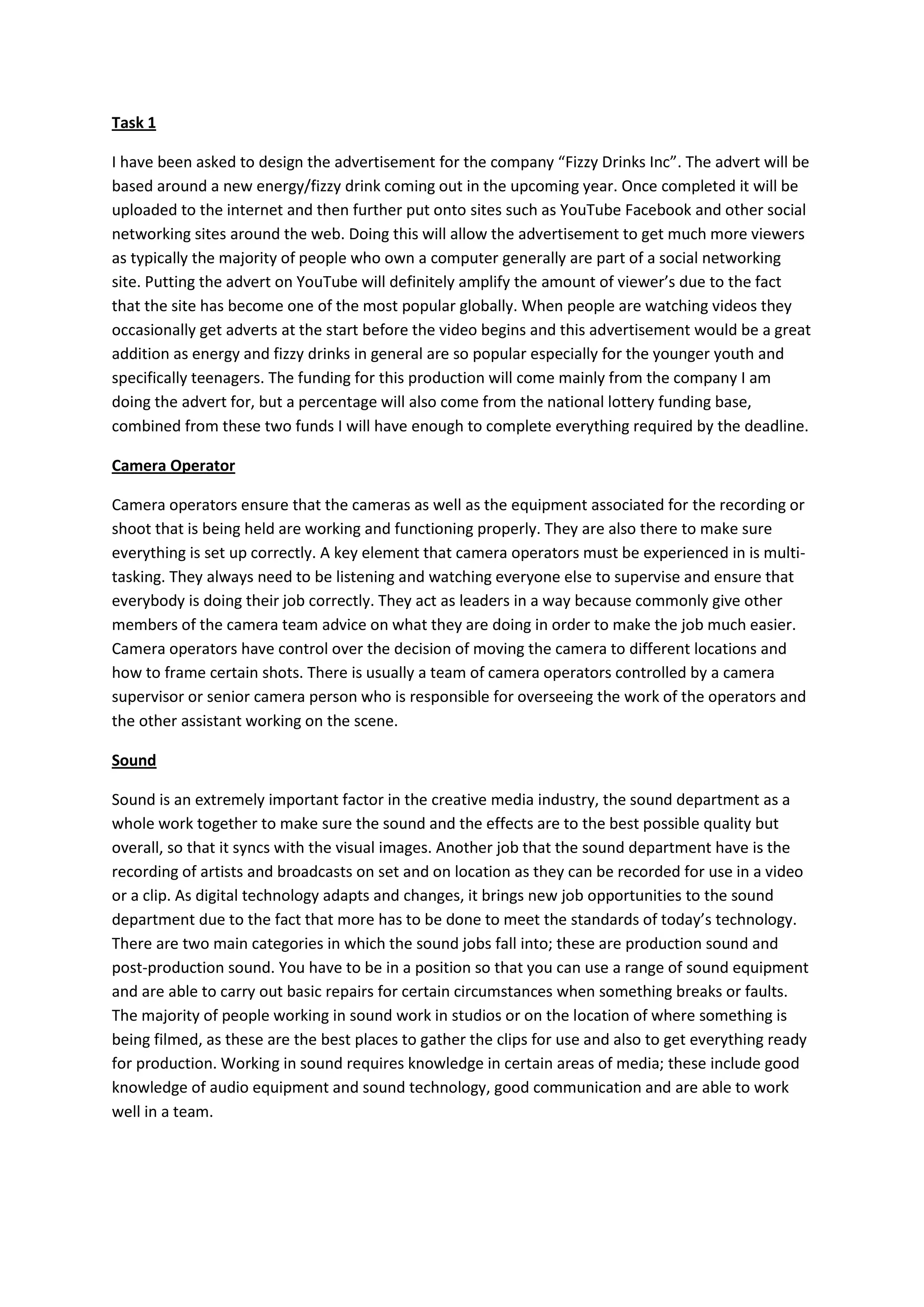 The document provides job descriptions for several roles in the creative media industry. It describes camera operators as ensuring equipment is working properly and framing shots under the direction of a supervisor. Sound department jobs include recording audio on set and using equipment to capture high quality audio that syncs with video. Hair and makeup artists are responsible for making characters look realistic through wigs, hairpieces and other alterations based on the production. Editors put together clips, add effects, and make artistic choices to finalize films, requiring experience with editing software and computers.