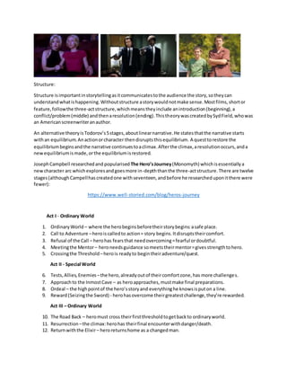 This document discusses several key aspects of narrative structure in film, including formats and purposes of short films, components of narrative, character archetypes, themes, and analyzing short film structure. It provides definitions and examples for formats, narrative elements like plot and story, character roles from Vladimir Propp's theory, narrative effects, and analyzing the structure and techniques used in three short films. Genre is also defined as a category system based on similarities in narrative elements or emotional response.