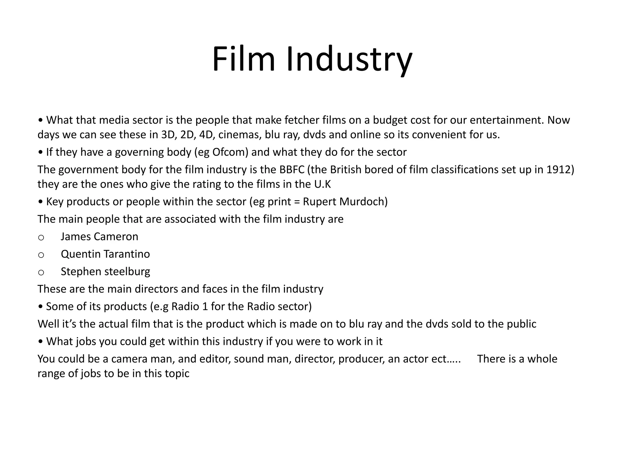 [1] The film industry is governed by the BBFC and produces films distributed in theaters, Blu-ray, DVDs, and online. Key people include James Cameron, Quentin Tarantino, and Steven Spielberg. Jobs include camera operators, editors, sound technicians, directors, producers, and actors.