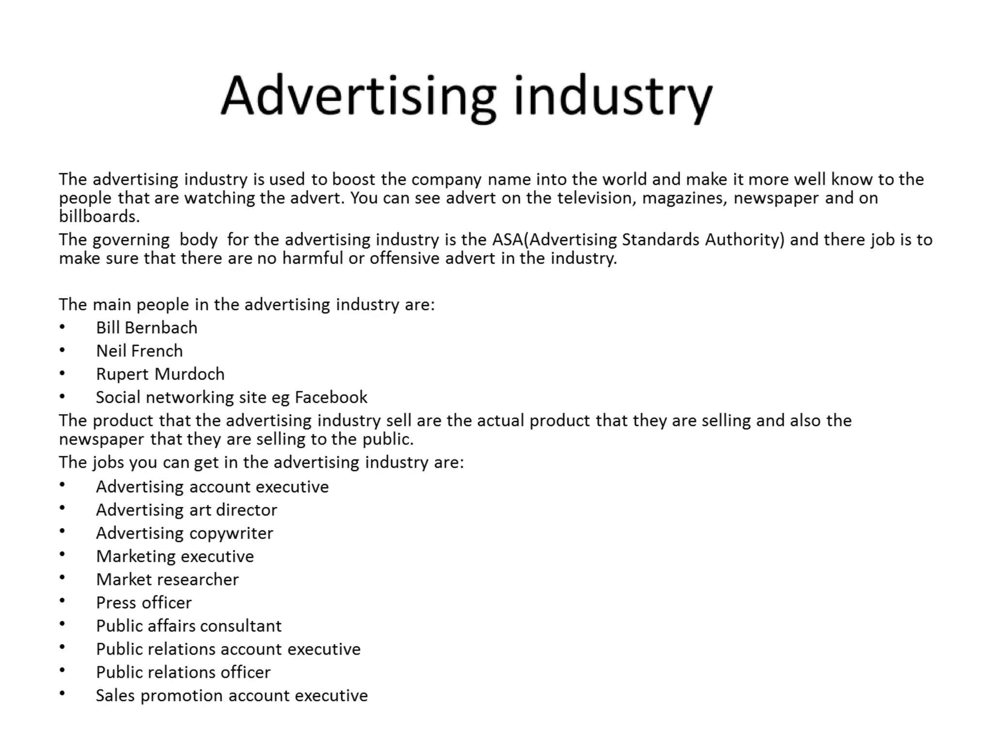 [2] The print industry is governed by the BPIF and produces newspapers, magazines, and billboards. Rupert Murdoch is a key figure. Products include The Sun, Daily Mail, and Guardian. Jobs include journalists, print production, and photographers.
