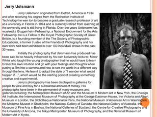 Jerry Uelsmann originated experimental photography in the 1960s using darkroom techniques like multiple enlargers and masking to combine negatives into surreal composite images. He was influenced by his professor Minor White to trust his intuition and experiment creatively. Uelsmann's work is in the permanent collections of major museums worldwide.