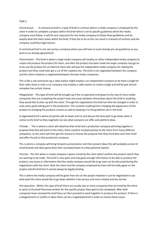 The document discusses different types of briefs that can be provided to media companies for projects. It describes contractual briefs which require strict adherence to guidelines. Commission briefs involve one media company hiring another to create a product. Negotiated briefs allow parties to discuss and modify the brief. Tender briefs involve companies proposing ideas to a client in a competitive pitch process. Formal briefs provide open outlines for media companies to interpret. Cooperative briefs involve multiple companies working together on a brief. Informal briefs are verbal discussions of project requirements. Competition briefs allow any company to submit entries for a client to judge.