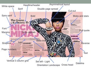 This document identifies various page elements that can be used in layout design such as margins, fonts, grids, orientation, headlines, rules, whitespace, and other typographic elements. It provides examples of common page features like serif and sans serif fonts, baselines, pull quotes, and asymmetric or symmetrical layouts that can aid in visually presenting information on a page.