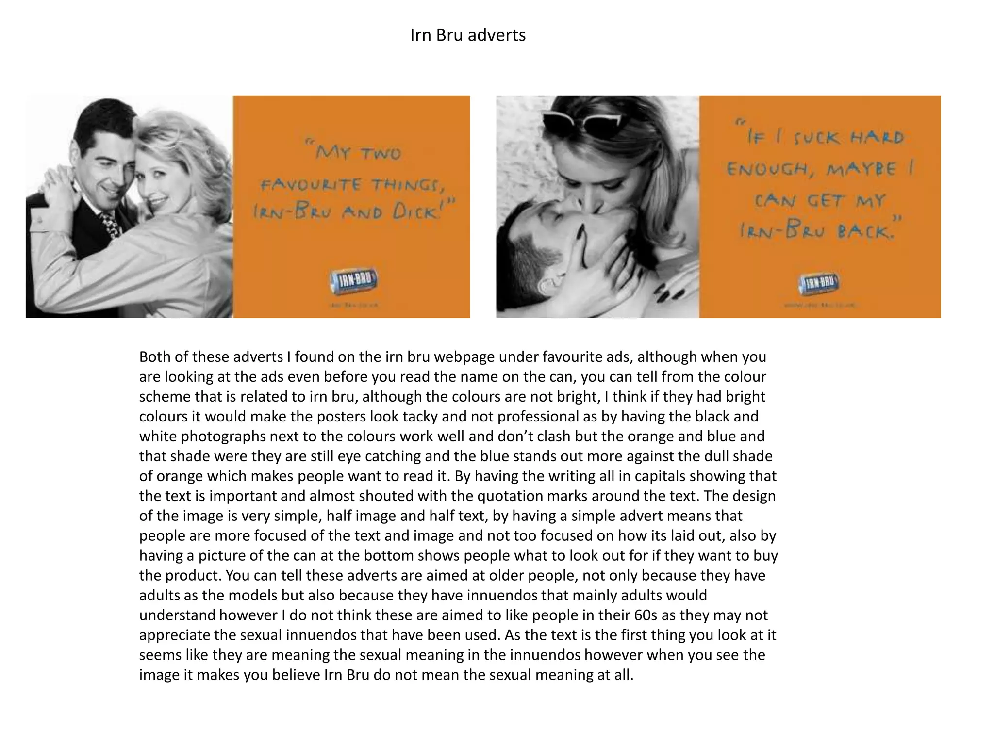 This document summarizes and compares advertisements and marketing strategies for several energy drink brands, including Irn Bru, Relentless, Monster, and Rockstar.