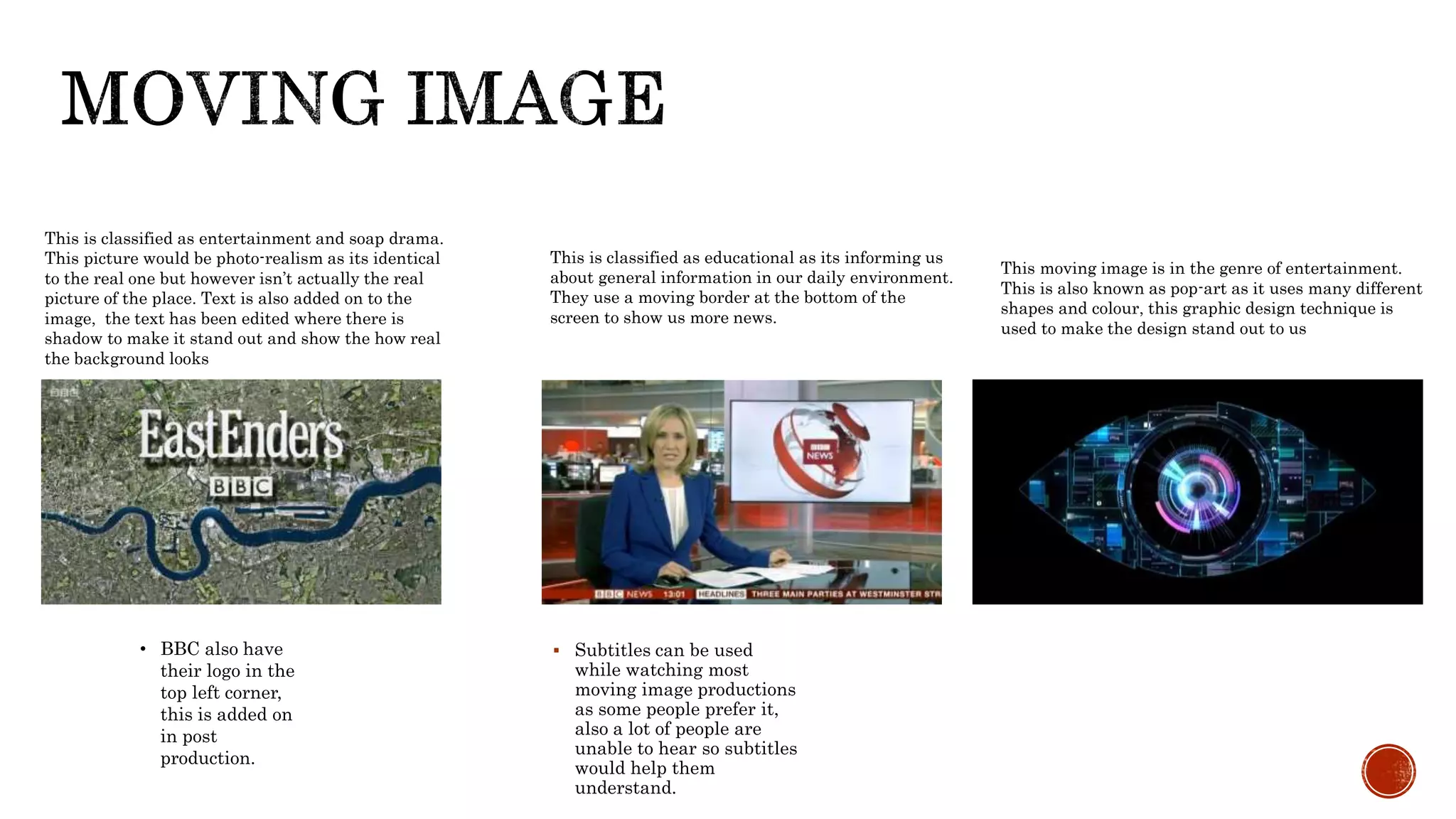 This document discusses and analyzes several different media examples including films, games, and television. It examines the genres, graphic techniques, and other key elements used. Subtitles are discussed as being useful for some viewers to understand media. BBC productions are noted as adding their logo in post-production. Different games and covers are classified based on their genres like simulation, adventure, or use of techniques like photorealism, collages, and pop art. Driving and racing games are a common theme discussed, with maps and detail levels compared between portable and other versions.