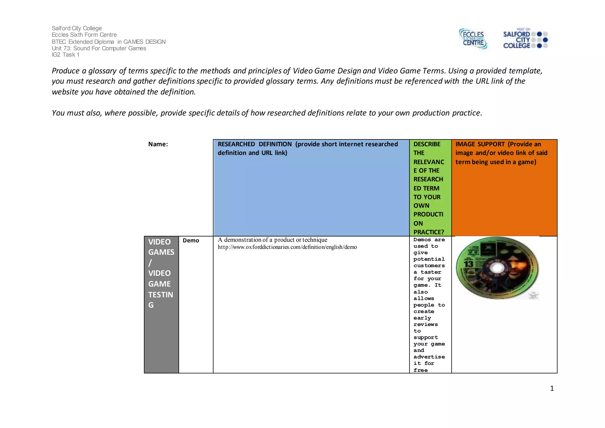 This document contains a glossary of terms related to video game design. It includes over 30 terms with short definitions from online sources. For each term, the document provides a short description of how the term relates to the production practice of video games. The glossary covers topics such as game engines, testing, animation, physics, and user interfaces.