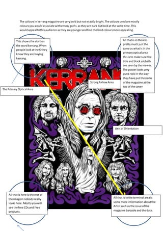 The document summarizes and compares the design elements, target audiences, and genres of two music magazines: Kerrang and Q Magazine. Kerrang uses bold, dark colors that would appeal to emo/goth audiences. The text is large and focuses on punk/rock bands to attract younger readers. Q Magazine uses brighter colors as it covers both rock and chart music. It aims for a slightly broader audience. Both magazines use their logo prominently and include information about artists, issues, and dates in the terminal area.