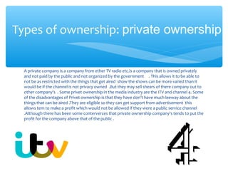 The document discusses different types of media ownership including private, public service, independent, conglomerate, horizontal integration, and vertical integration. It provides ITV and the BBC as examples. ITV is a privately owned company in the UK television industry, while the BBC is a public service broadcaster funded by license fees. The BBC has expanded through both horizontal and vertical integration to include multiple TV and radio channels.
