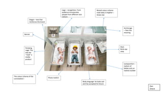 The document discusses several advertisements, including ones aimed at preventing teenage pregnancy and smoking. One ad features a sad baby who acknowledges the difficulties of having a child as a teenager. Another realistic ad depicts a baby smoking to convince viewers that smoking can lead to health issues like cancer. The ads use techniques like photo-realism, simple text and slogans, and trusted organizations or companies to deliver their messages about the risks of early parenthood and smoking.