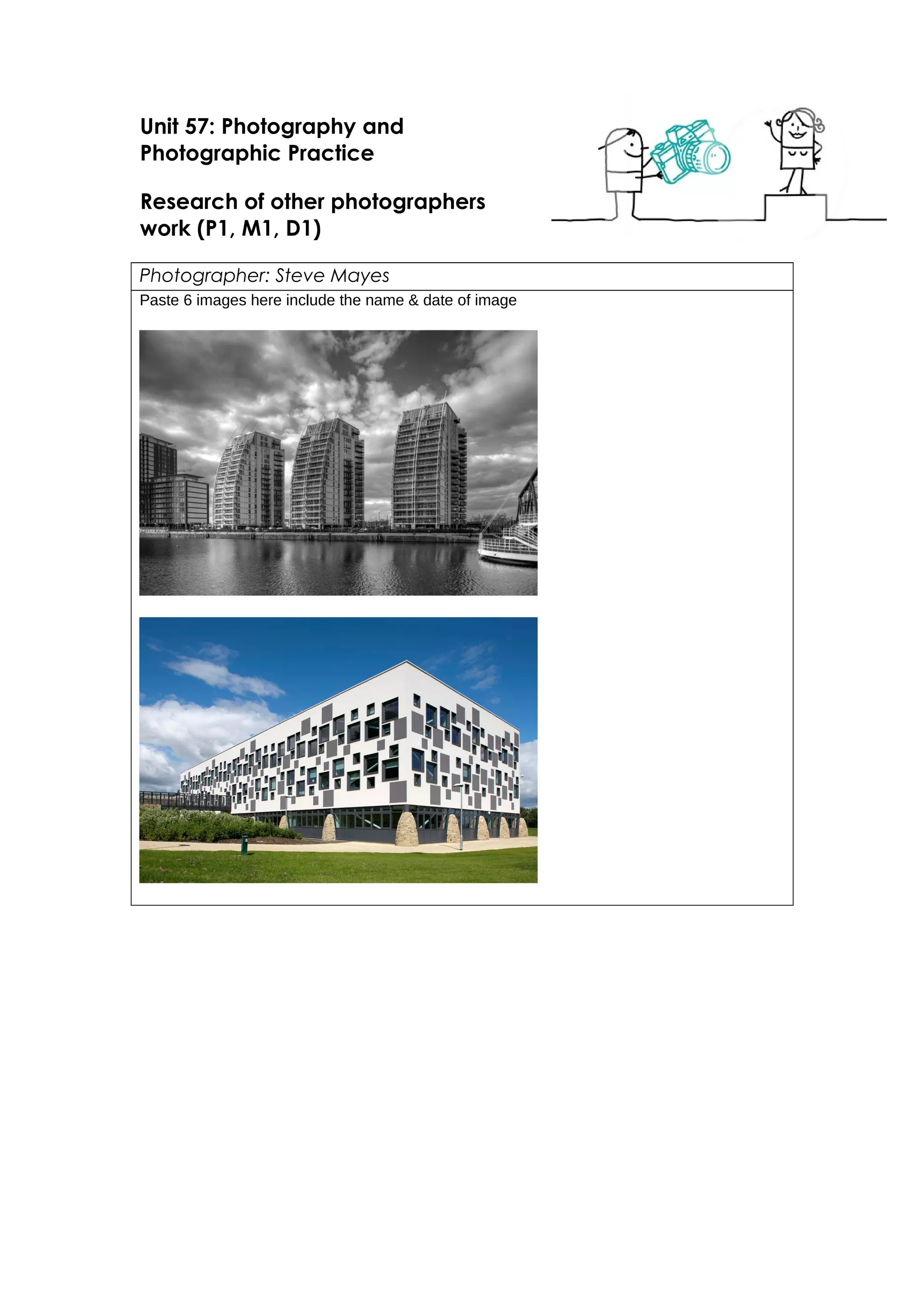 The document analyzes a series of photographs taken by Steve Mayes in 2014 of buildings. It summarizes that the photos focus on capturing the beauty of everyday spaces like workplaces, living spaces, and schools through architectural details. The photographer aims to include as much of each building as possible from diagonal angles. Techniques discussed include using fast shutter speeds in bright light and longer exposures in darker scenes, as well as following the rule of thirds. Strengths are comprehensively framing shots, while weaknesses include including unnecessary elements like car parks.