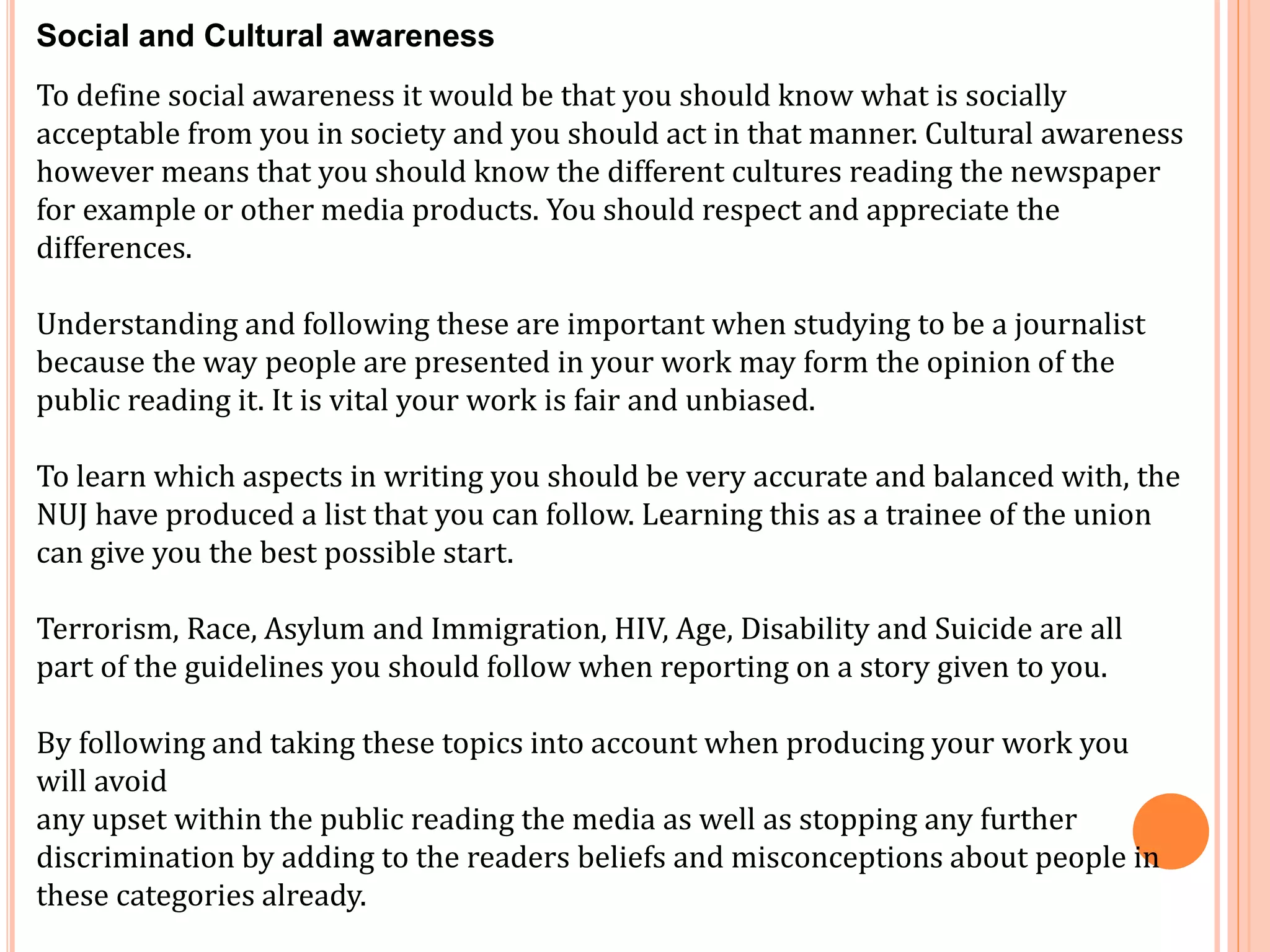 The document provides guidelines for writers on their social and cultural responsibilities when reporting stories. It discusses the importance of being fair, unbiased, and respecting differences. It also outlines the 12 rules of the NUJ code of conduct, including obtaining information honestly, correcting inaccuracies, differentiating facts from opinions, avoiding intrusion or causing harm, and not plagiarizing. The code helps ensure information is presented accurately and avoids discrimination or influencing public beliefs in a negative way.