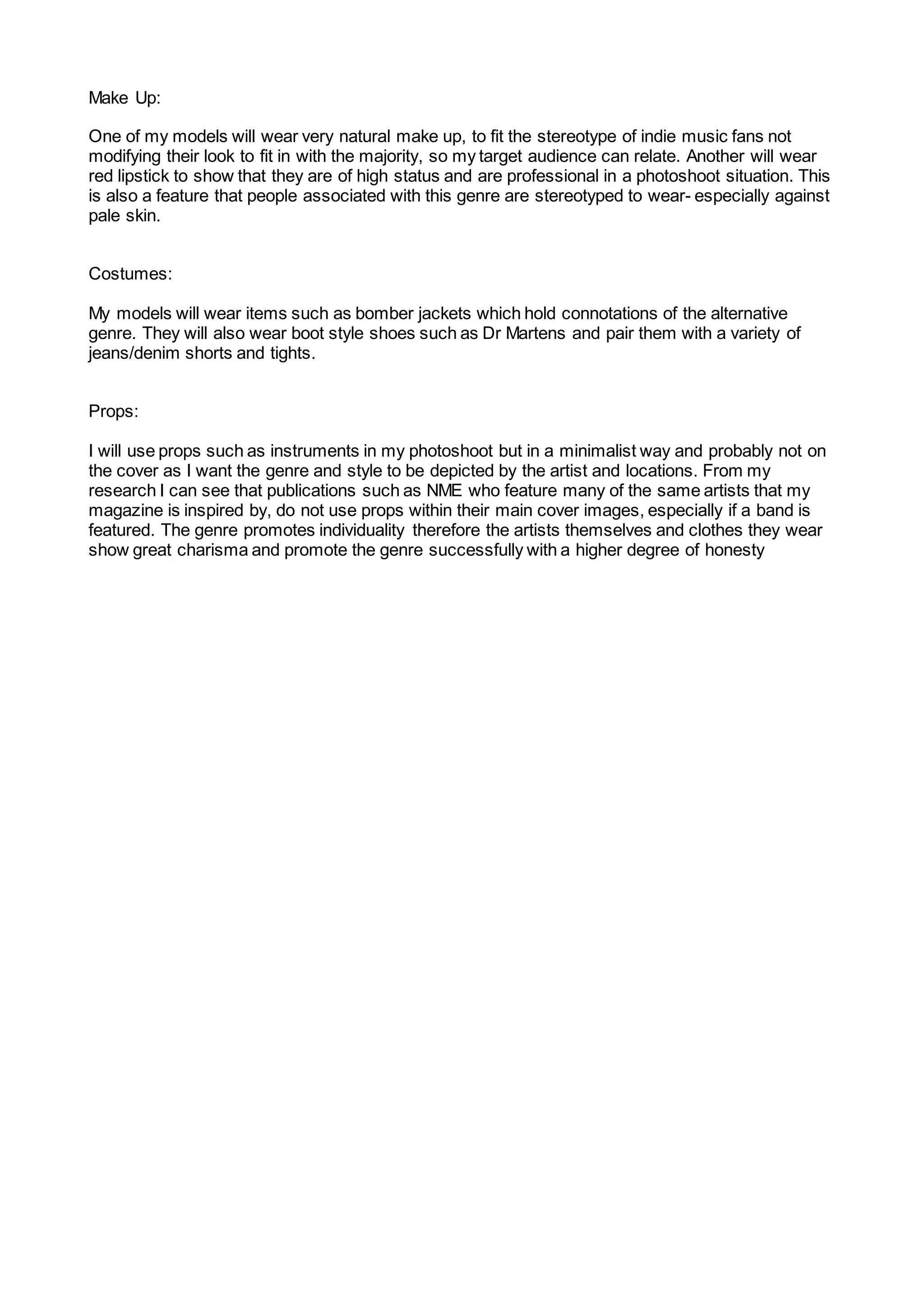 One model will wear natural makeup to appeal to indie music fans who don't modify their look, while another will wear red lipstick, a stereotypical feature associated with the genre. Models will wear items like bomber jackets and Dr. Martens boots paired with jeans and tights to depict the alternative genre. Props like instruments will be used minimally and not on the cover, as individuality and artist style alone can successfully promote the genre with honesty.