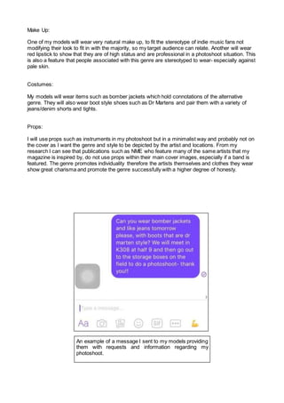 One model will wear natural makeup to fit the indie music stereotype while another will wear red lipstick to portray status. Models will wear items like bomber jackets and Dr. Martens boots associated with the alternative genre. Props like instruments will be used minimally and not on the cover to depict the genre through the artists and locations instead of props, focusing on individuality and honesty.