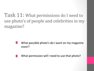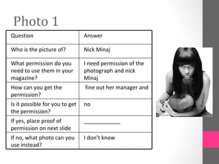 To use photos of people and celebrities in a magazine, permission is needed from both the photographer and the subject of the photo. The permission typically involves getting a signed model release form from the subject granting rights to use their image, and contacting the photographer to purchase or license the photo. For the sample photos of Nicki Minaj, Rosie Huntington-Whiteley, and Zac Efron, it would not be possible to obtain permission to use the photos in the magazine. Alternate photos without recognizable celebrities would need to be selected instead.