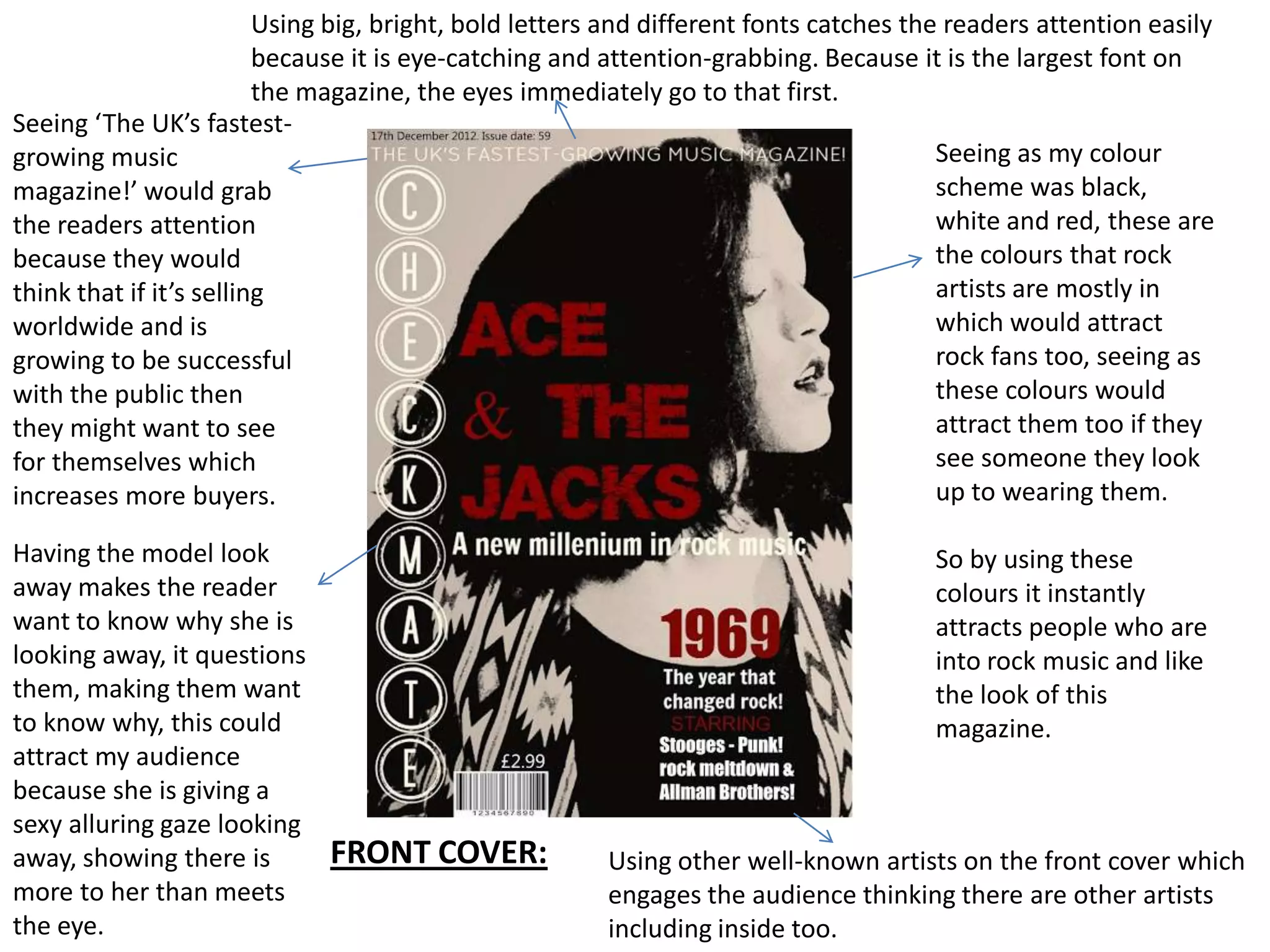 The cover used large bold fonts, bright colors like black, white and red that are popular with rock music fans, and prominent placement of well-known artists to catch readers' attention and attract rock music enthusiasts. Multiple models with direct gazes at the camera and intriguing expressions like looking away engaged and questioned the audience. Pull quotes, capitalization, and consistent formatting kept readers interested in learning more about the stories and artists featured.
