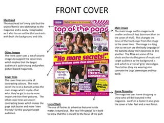 The magazine uses a pink color scheme and images of boy bands to appeal to its young, female target audience. There is no single dominant image on the cover, focusing more on cover lines. Inside, article pages use pink banners and mastheads for branding and easy-to-read fonts with short sentences and many images. Advertisements blend in with the page layout and color scheme rather than standing out.