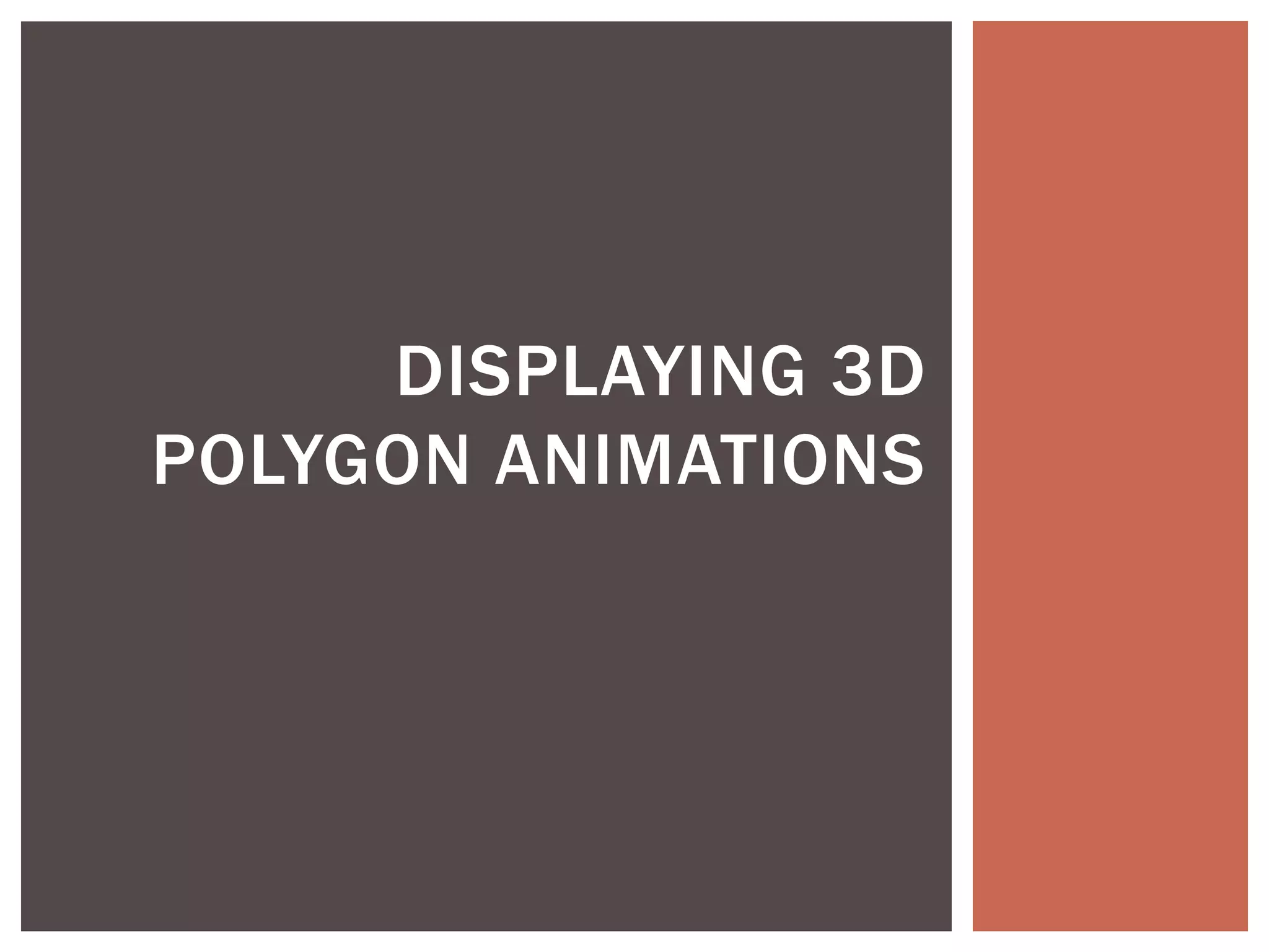 The document discusses the key concepts and stages involved in displaying 3D polygon animations, including application programming interfaces (APIs) like Direct3D and OpenGL that help programmers develop 3D programs. It then covers the graphics pipeline which involves transforming 3D models into 2D images through steps like modeling, camera transformations, lighting, projection, clipping, rasterization, texturing and fragment shading before final display.
