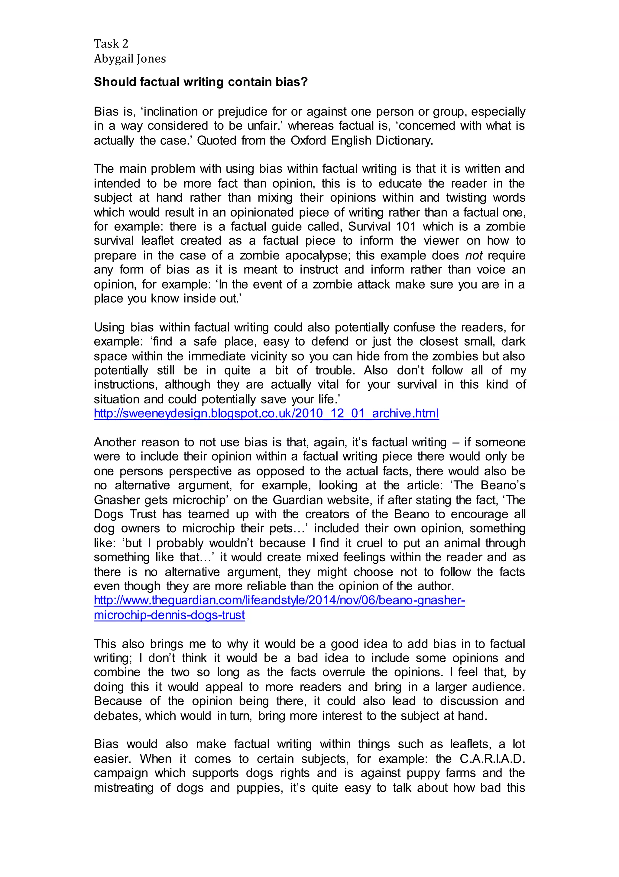 The document discusses whether factual writing should contain bias. It notes that bias means having a prejudice for or against a group, while factual writing aims to present what is actually the case without opinion. Using bias in factual writing could confuse readers by mixing facts and opinions without an alternative perspective. However, bias could make some topics easier to discuss and engage readers if opinions are supported by facts. Overall, the document argues that factual writing generally should not include bias because its purpose is to present facts rather than opinions, though bias may occasionally be acceptable if an issue clearly has only one justifiable side.