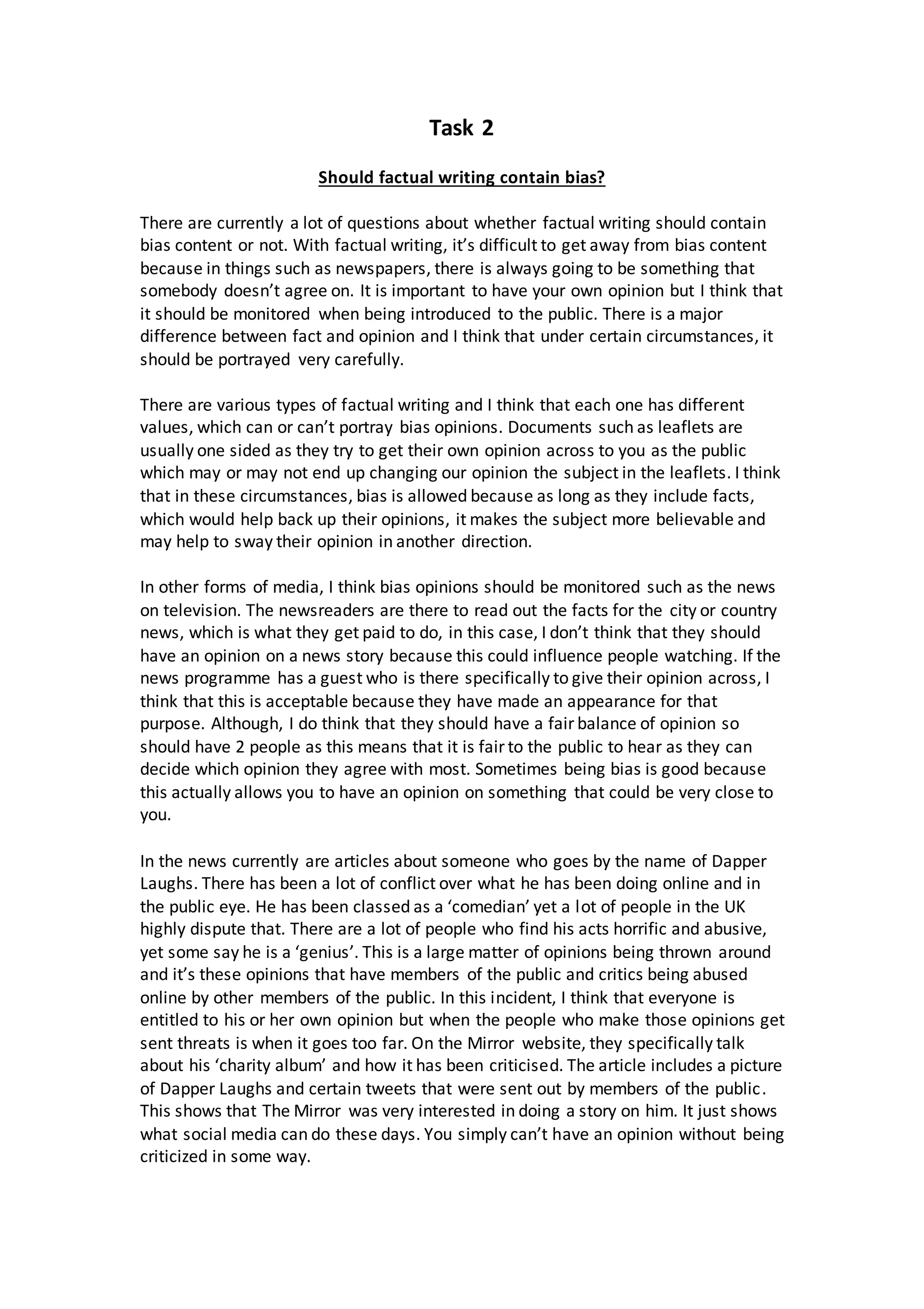 This document discusses whether factual writing should contain bias. While it is important for writers to have their own opinions, bias should be carefully portrayed when information is presented to the public. Factual writing comes in different forms, some of which are more appropriate for bias than others. News reports should aim to just present facts and not opinions of anchors, though guest contributors there to provide an opinion are acceptable. Overall, bias is sometimes part of jobs like newspaper columnists where debate is encouraged without harm.