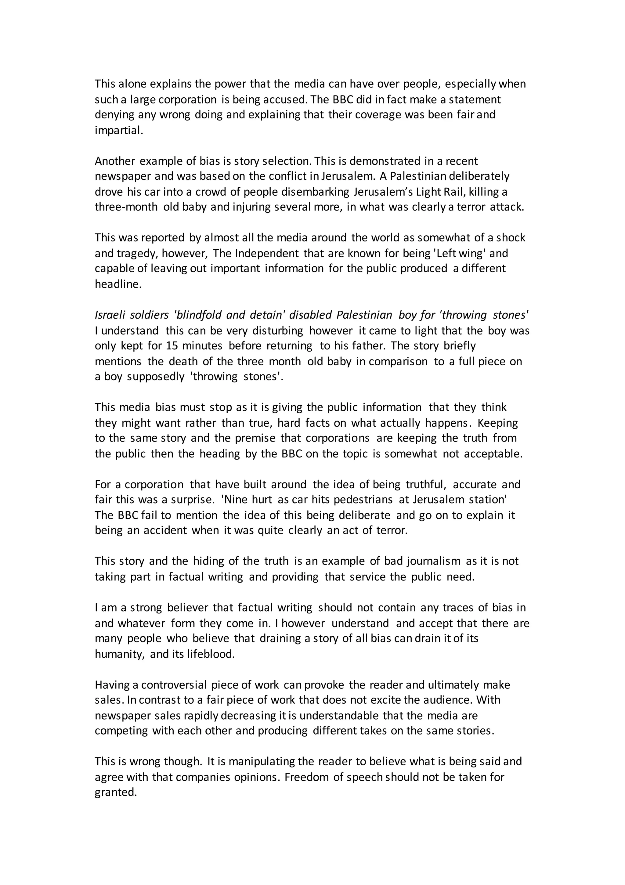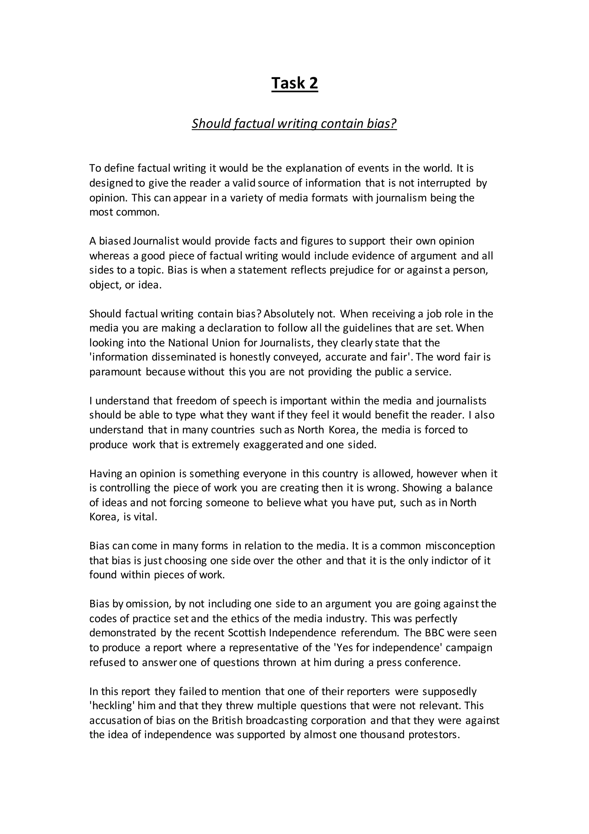 The document discusses whether factual writing should contain bias. It argues that factual writing is meant to inform readers without opinion so they can form their own views based on facts. Bias undermines this goal by selectively presenting information that supports one side over others. Examples are given of media outlets like the BBC and The Independent omitting important details or angles in their coverage of events like the Scottish independence referendum and a terrorist attack in Jerusalem in ways that appeared to show bias. The document concludes that factual writing should not contain bias as the media's role is to fully and fairly inform the public without manipulation.