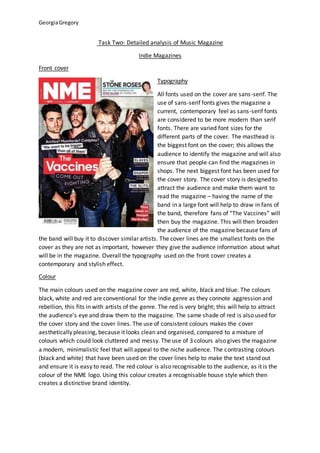 The document provides an analysis of the design elements of the front cover and contents page of an indie music magazine. On the front cover, sans-serif fonts in varied sizes are used to draw attention to key information. Red, black, and white are used to create a contemporary style aligned with the genre. The cover image depicts the band in stereotypical rock poses. On the contents page, a mix of serif and sans-serif fonts and bold/plain text are used, along with images of famous artists, to attract readers' attention. The double page spread employs serif fonts, columns, and images of the artist to present information in a conventional magazine format.