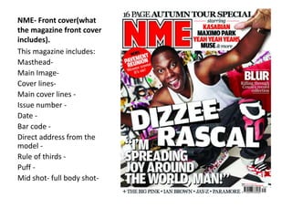 This document summarizes the key elements typically included on the front cover of the NME (New Musical Express) magazine. It discusses the masthead, main image, cover lines, issue number, date, barcode, and other standard front cover elements. It also analyzes design choices like the use of color, layout, and photo composition to appeal to NME's target audience of young, alternative music fans in the UK. Elements are strategically placed following principles like the rule of thirds to guide the audience's eyes.