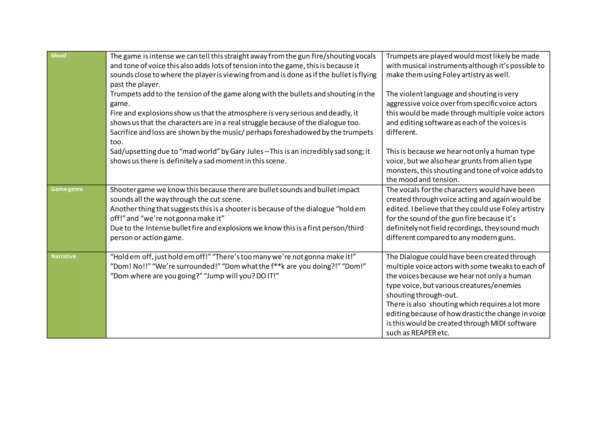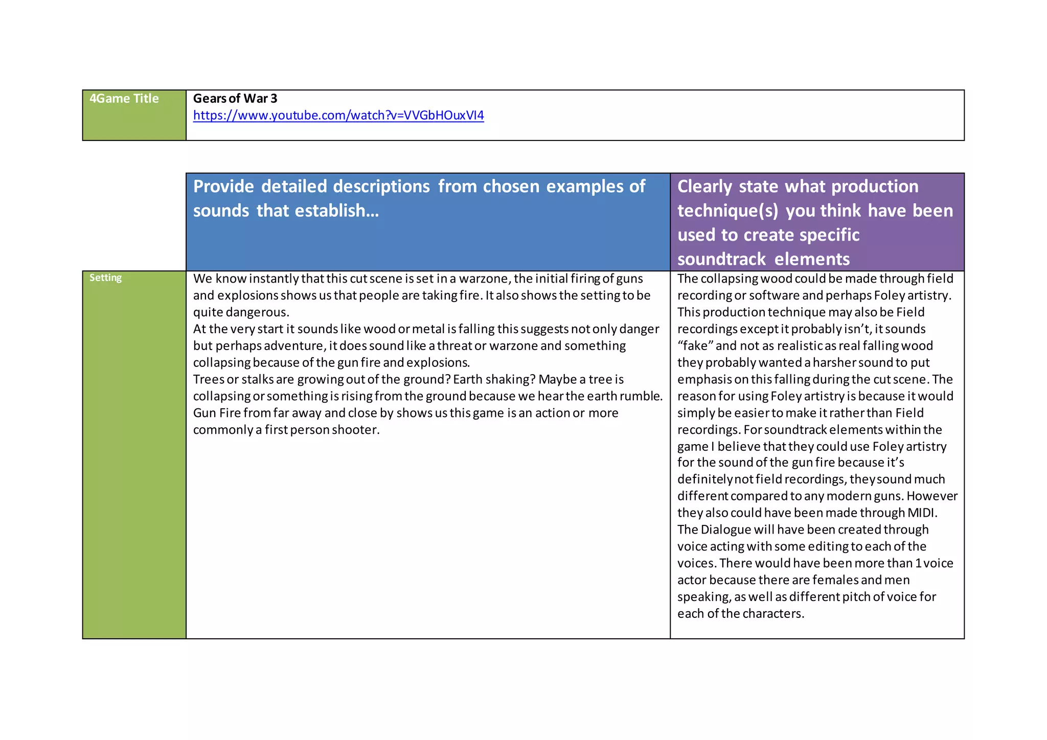 This document analyzes sound elements in the Gearsof War 3 game trailer to determine the production techniques used. Gunfire, explosions and shouting establish an intense war setting. Foley artistry was likely used to create the falling wood sound for emphasis during the cutscene. Voice acting with editing was used for character dialogue between multiple speakers. Trumpet music and vocals add tension while fire and explosions convey a serious atmosphere. The narrative involves characters being surrounded and in danger, showing it is an action shooter game genre through the dialogue and intense sound effects.