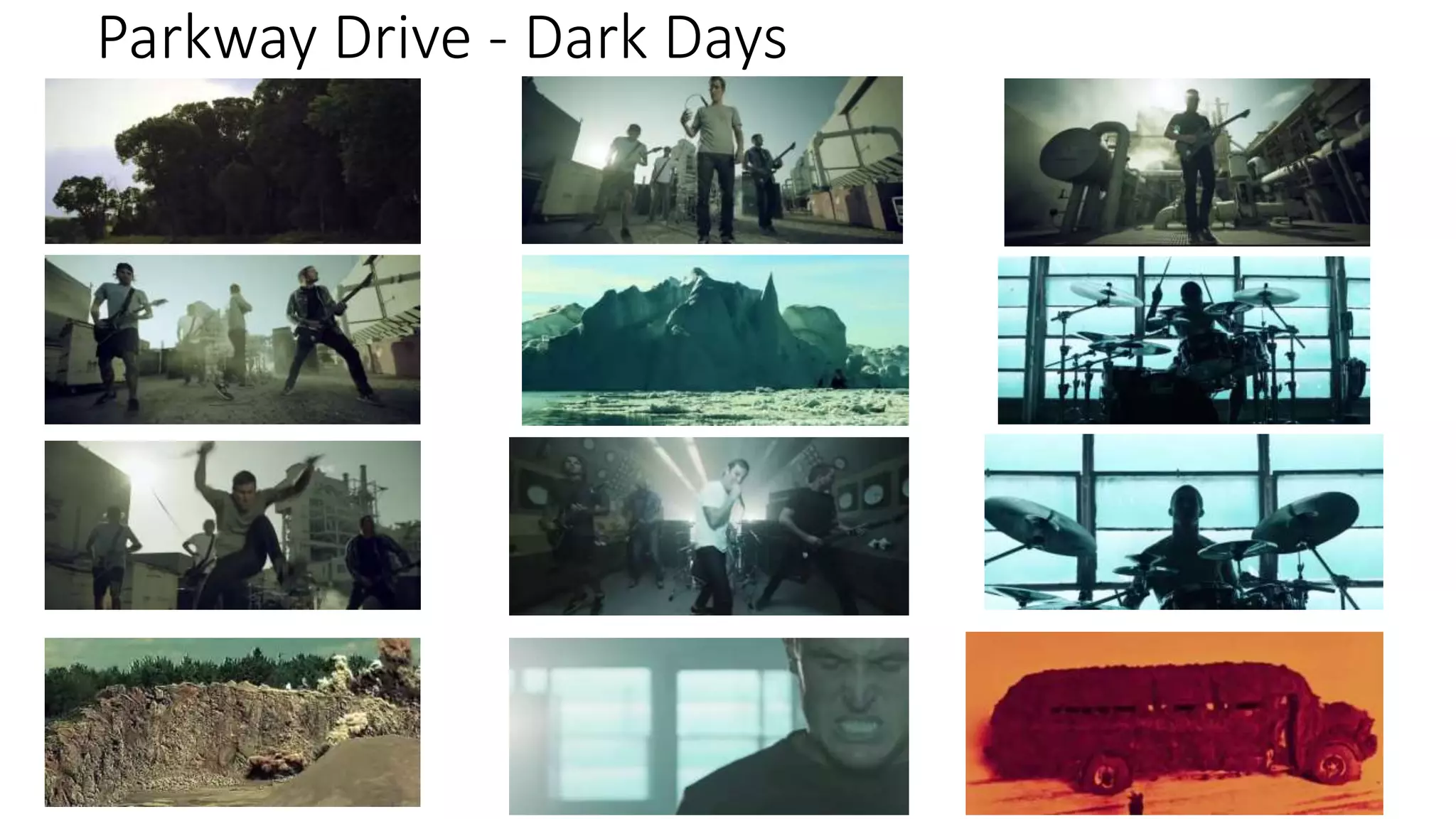 The document summarizes the mise-en-scene, editing, and camera techniques used in the Parkway Drive music video "Dark Days". It notes that the casual clothing, lack of other people, and instrumental props are meant to give a live feeling. Unlike other heavy metal videos, it uses varied locations that reflect the lyrics but keeps the editing simple. The camerawork features mid shots and long shots instead of close-ups to decrease intensity while the audio remains intense.