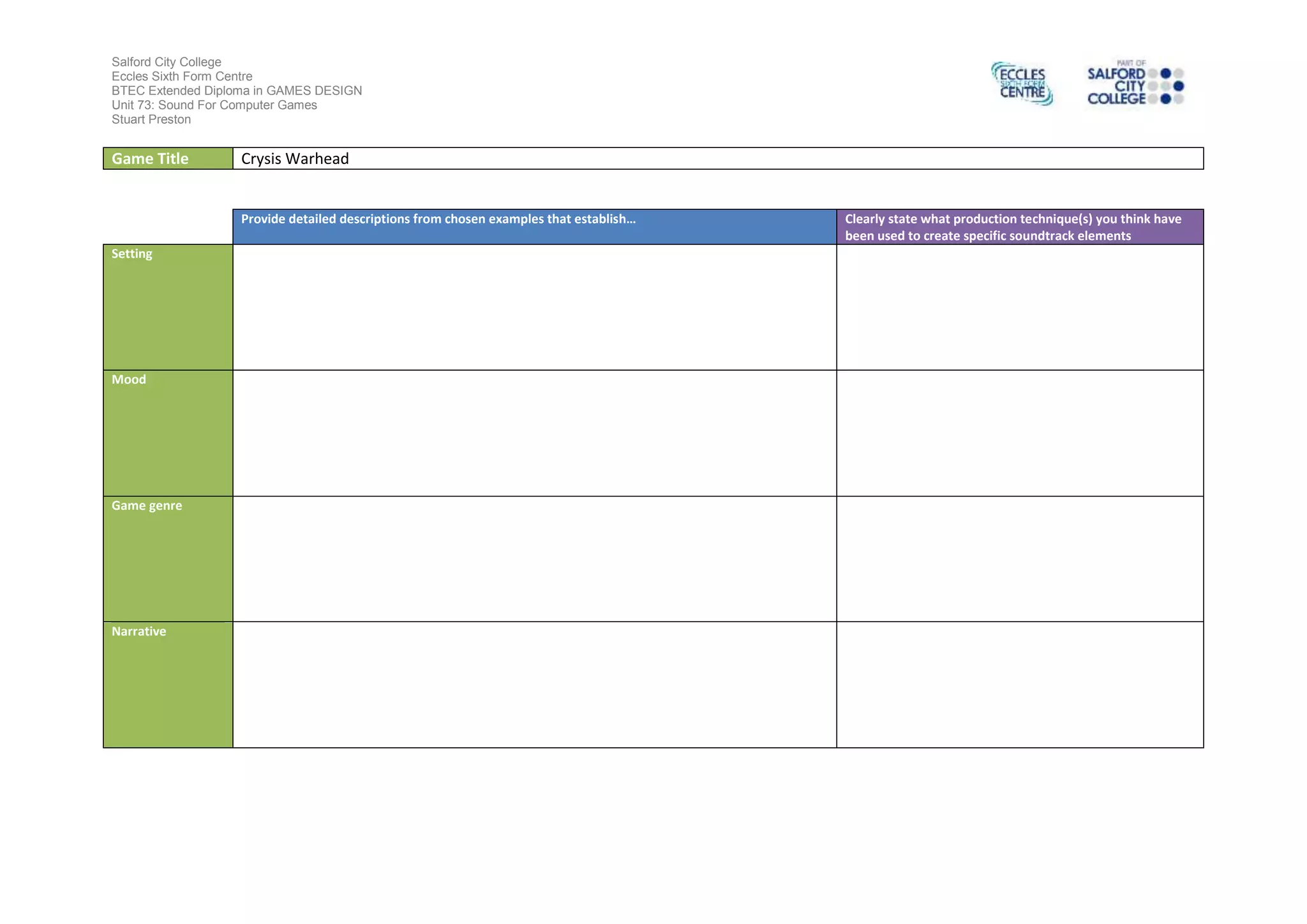 This document discusses a student's analysis of the soundtrack for the first-person shooter game Crysis Warhead. The student describes the setting, mood, and narrative established by specific soundtrack elements and identifies the production techniques used to create those elements.