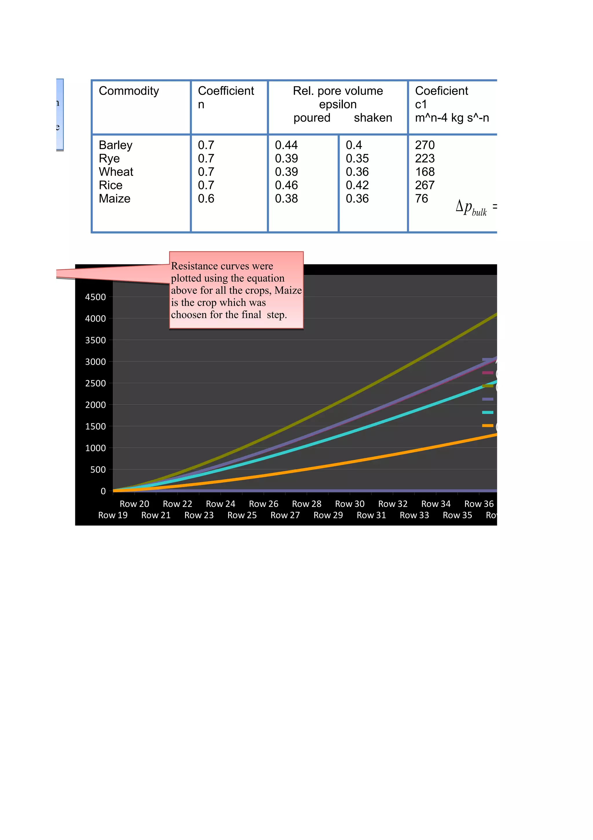 The document describes experiments to determine the pressure drop and airflow rate through a storage bin filled with different commodities. Equations were fitted to resistance curves for maize using data points from manufacturers. The coefficients were determined through iteration to achieve an airflow rate of 1.5 m3/s at a pressure of 750 Pa, making maize suitable for the storage application.